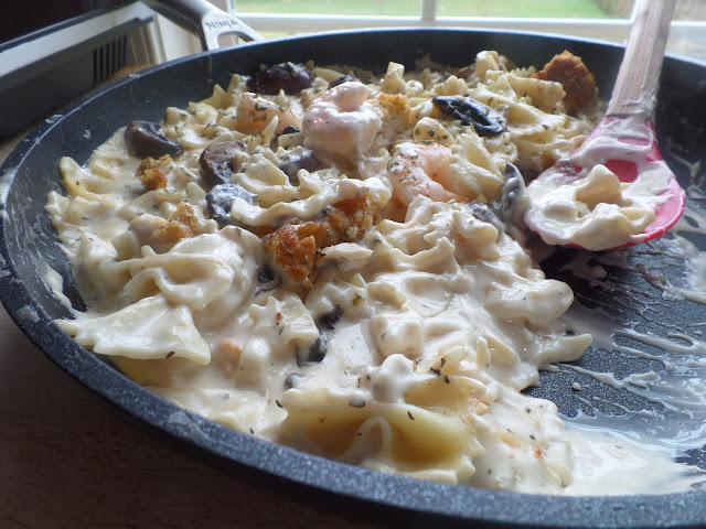 Once the sauce is the right consistency, add in your mushrooms, chicken and shrimp and stir to coat. Then add in your pasta and toss to coat with sauce.